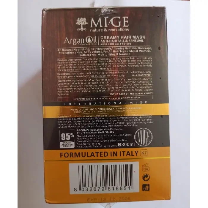 قیمت ، خرید و طرز استفاده ماسک میگ Mige بدون سولفات حاوی روغن آرگان Argan Oil حجم 800 میل اصل ایتالیا